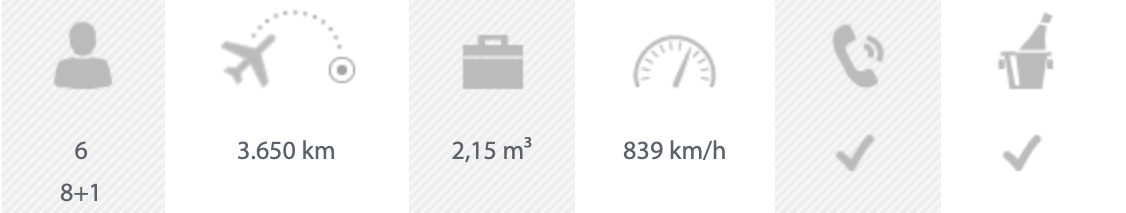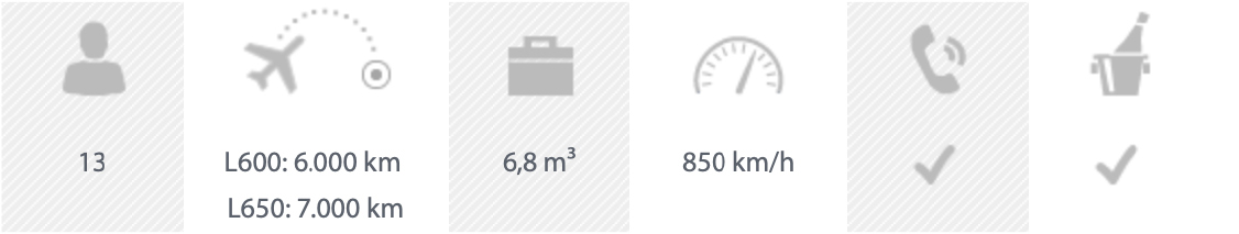 Die Embraer Legacy 650 ist mit bis zu sechs Betten und drei Kabinenbereichen der größte Jet. Eine ruhige Kabine ermöglicht auf längeren Flügen einen erholsamen Schlaf. Außerdem bietet die Legacy 650 den größten, begehbaren Gepäckraum ihrer Klasse. Passagiere haben auch während des Fluges Zugang zu ihrem Gepäck.